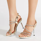 Crafted with rhinestone-wrapped straps, a comfort-boosting insole, and an adjustable buckle these high stiletto silhouette steal the spotlight. A statement piece to add to your wardrobe for formal events or nights out.