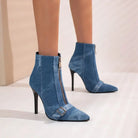 Crafted with premium denim, these stiletto booties feature a sleek zipper front closure and a metal buckle accent. Whether paired with pants or a flirty dress, they’re the bold statement to any outfit.