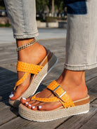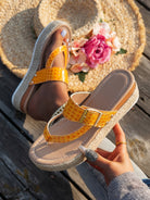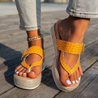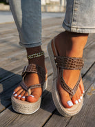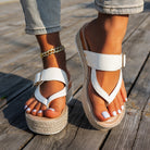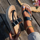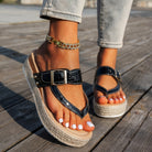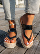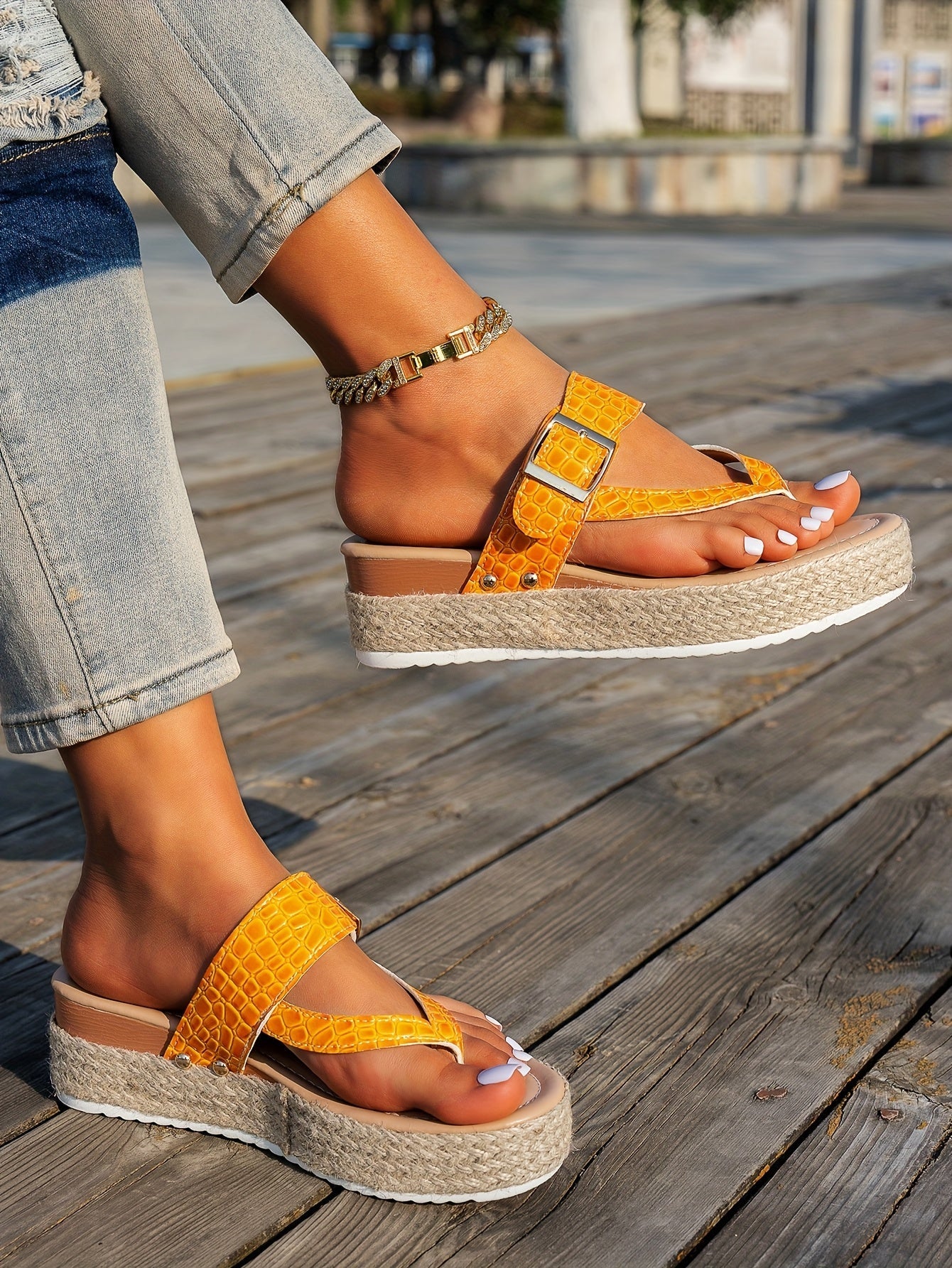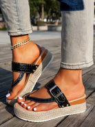 Step into effortless elevation with the Coastal Stitch Platform Sandals. Featuring croc-embossed vegan leather, a polished buckle strap, and a braided jute-wrapped sole, these sandals merge rustic texture with clean urban lines. Whether styled with light denim or flowing linen, they balance breezy comfort and refined detail in one lifted silhouette.