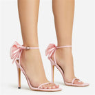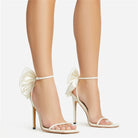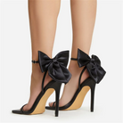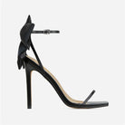 Crafted from premium vegan leather with a soft lining and secure wraparound ankle strap, these heels blend statement style with graceful support. Elevated by a dramatic satin bow and sculpted stiletto heel, they bring just the right touch of modern romance.