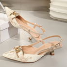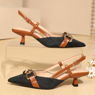 A chic embroidered design and pointed toe give these kitten heels a striking, stylish silhouette that stands out in any setting. Finished with gold chain detailing and a cushioned sole, they offer comfort and charm you’ll want to wear everywhere.