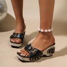 Crafted with bold buckles, woven textures, and studded edgework, these wedge sandals blend retro flair with a lightweight, cushioned sole that feels as good as it looks. The sculpted heel offers added stability, while the soft, contoured footbed and slip-on design keep you comfortably on your feet from beach walks to rooftop cocktails.