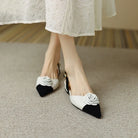 Crafted from smooth vegan leather with a bold two-tone design, these slingback low heels feature a sculpted flower accent and elegant pointed toe. A cushioned full-grain leather insole and low hoof heel offer all-day comfort with an effortlessly refined finish.